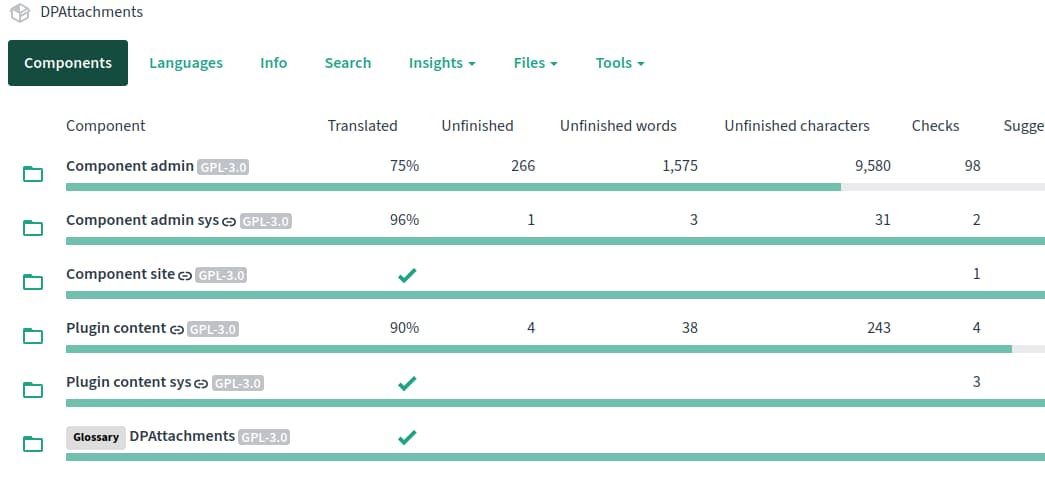 The DPAttachments Joomla project uses its own translation service to maintain all available language translations. Its an easy to use online tool based on Weblate, which can be used to update translations easily and without any in-depth or technical knowledge. Alternatively, it allows you to download the current translation and update it with your favorite tool. It also allows anyone to download the most current version of any translated file.