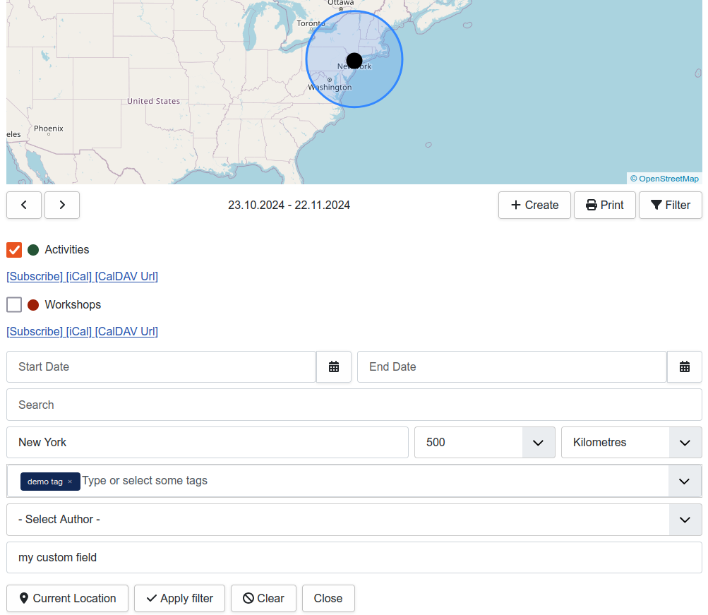 Searching specific events is a must for an event extension. Till now DPCalendar had very basic support for that which changed in this version. Every calendar, list and map view got some more enhanced filter possibilities, similar to what is available in the back end. Filtering by author, tags, location, text or calendar is now supported out of the box and each field can be hidden individually per menu item or globally.