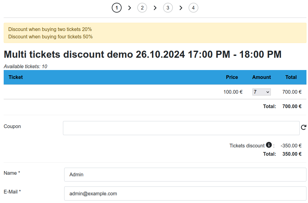 Lets make an example. You have a series of 10 events where each events costs 100 Euro. You can create a discount of 20% for 2 events and one about 50% for 4 events. If a visitor books now 7 events of that series within the booking process, then a discount of 50% is applied automatically and he has to pay only 350 Euros and not 700. The same can be configured for individual tickets.