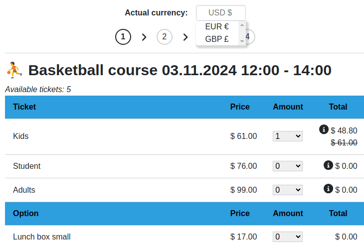An additional fee percentage can be configured which is added to the price. Often charge payment providers a fee when they need to exchange currencies into your default one. With this option you can forward that fee to the attendee. All the possibilities and more can be found in the respective booking system documentation.