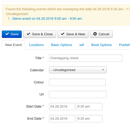 A check can be activated in the DPCalendar options when editing an event if it should be checked if there is already an event in that time frame. A warning will then be displayed above the input controls.