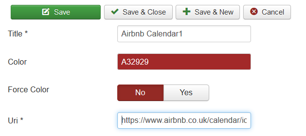 Simply paste your Uri into the Calendar Address (URL) field, give your Calendar a name e.g. DPCalendar1 and press the Import button, the Airbnb calendar will now synch with your Joomla site and continue to do so automatically every few hours.