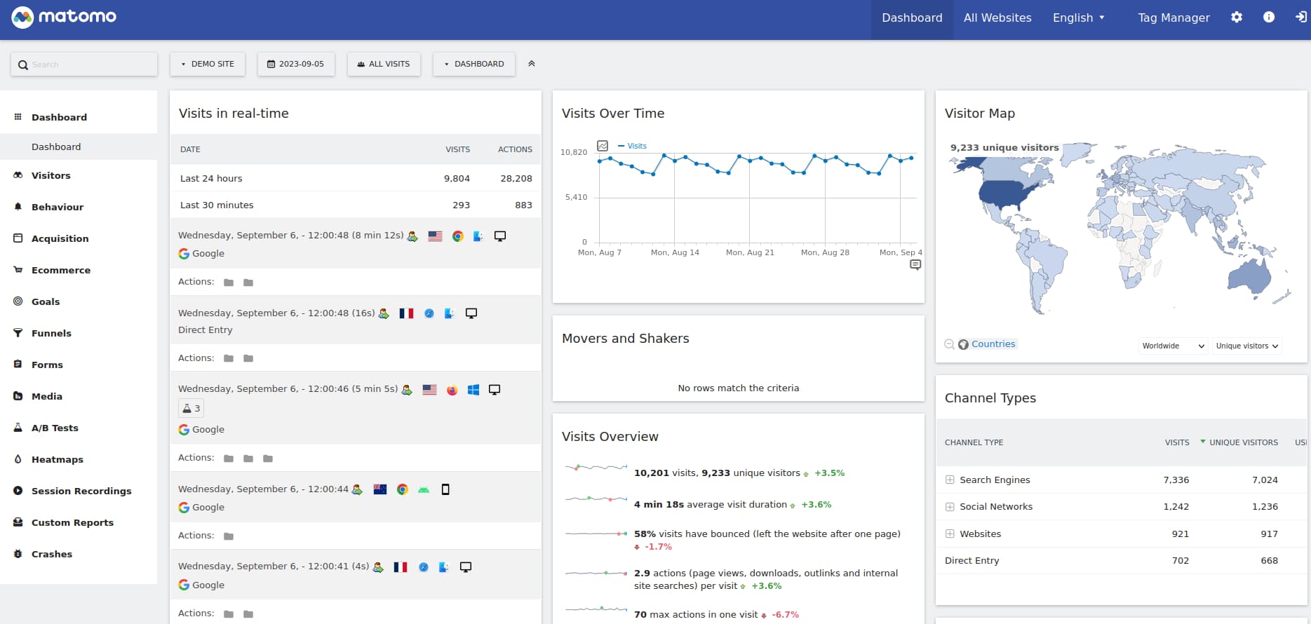 5. Visitor Tracking: Matomo offers detailed information about visitors, including their geographical location, referral sources, device types, and more. It also tracks the paths visitors take through the website and their interactions with specific pages and elements.