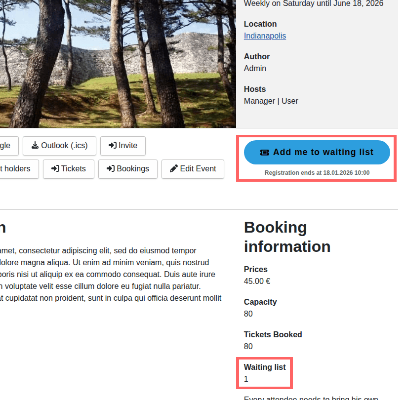 If an event has enabled the waiting list flag, then bookings can still be made, but are added to the waiting list when the capacity is full. The admin has to put the booking from the waiting state into either reviewed (paid bookings) or invited/activated (free bookings) once there is some free space available.