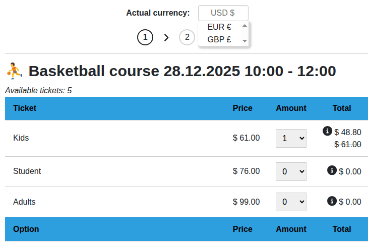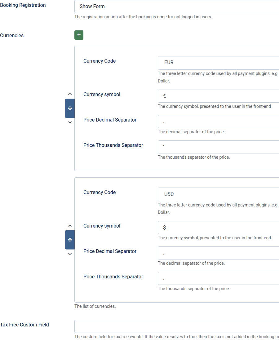 The DPCalendar booking system supports multiple currencies. This means that prices and booking options can be configured per currency. In the global DPCalendar options it is possible to define unlimited currencies, each one with the identifier, symbol, decimal separator and thousand separator.