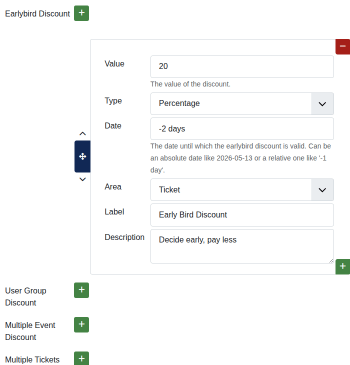 Discounts are rule based and applied when a rule fits the condition. The event author can define unlimited rules where a percentage or fixed value is subtracted from the ticket price.