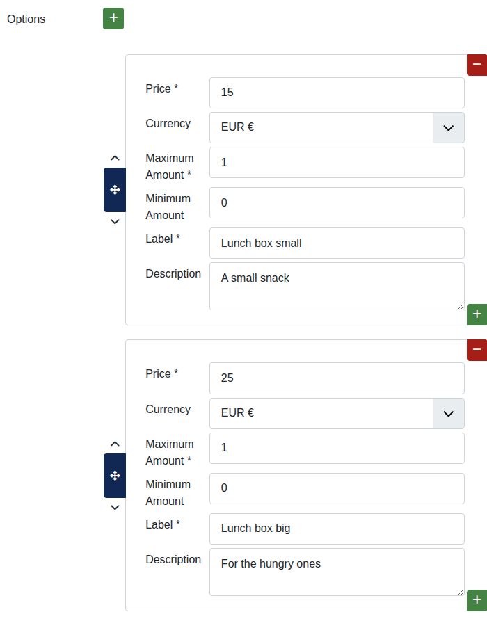 Beside the tickets you can define unlimited options for the event, where the user can choose from. These options can be free or have a price with a currency which is added to the ticket price. For example add different dishes with prices. So the visitor can choose the tickets they want and the dishes for the event.