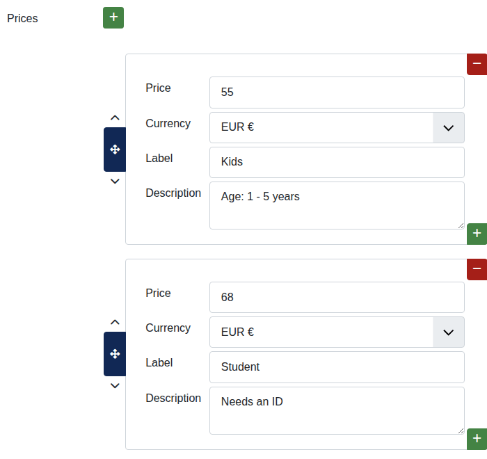 The author of the event can define an unlimited list of prices. Every price has a value, currency, label and description field. The price must be a two decimal float number like 5.05 or 122.10.