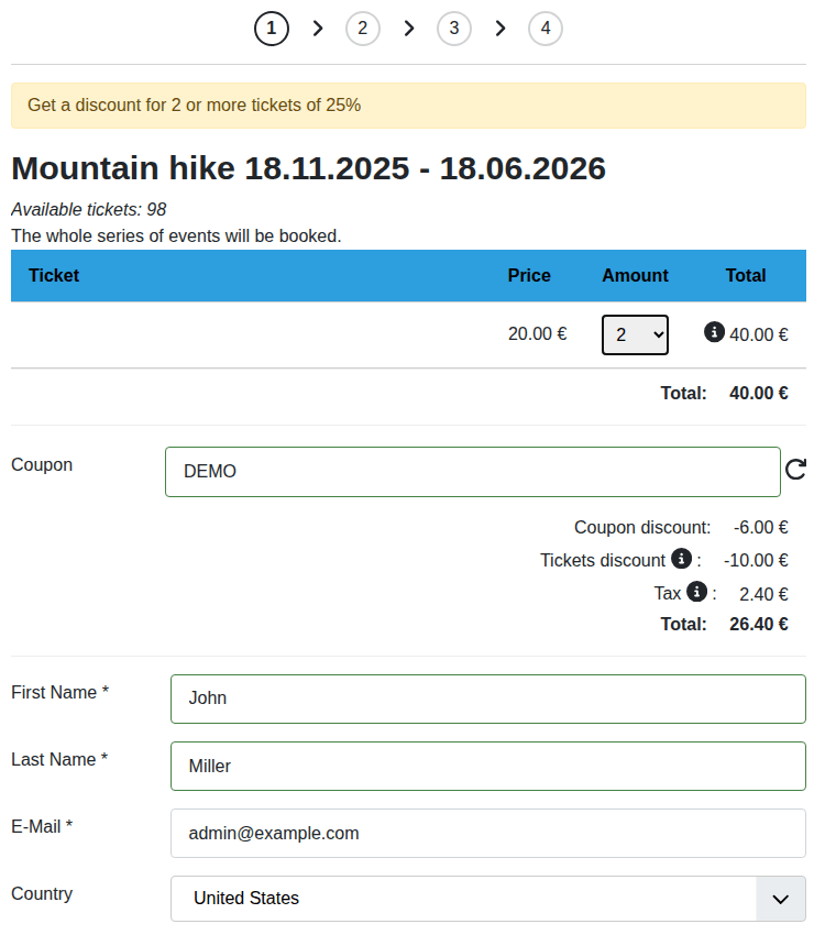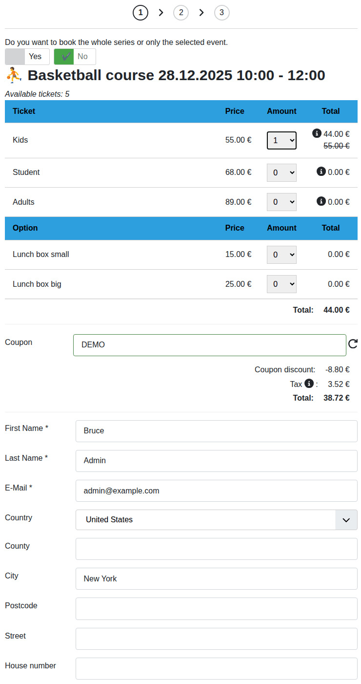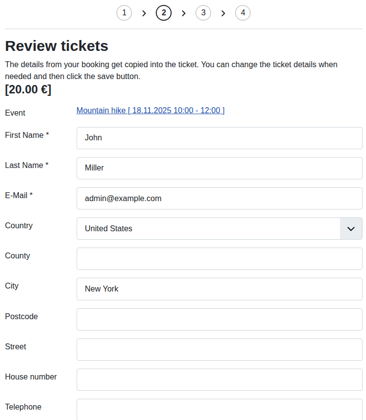 In the second step, the attendee has to review the tickets. The tickets inherit the values of the booking, but can be changed here.