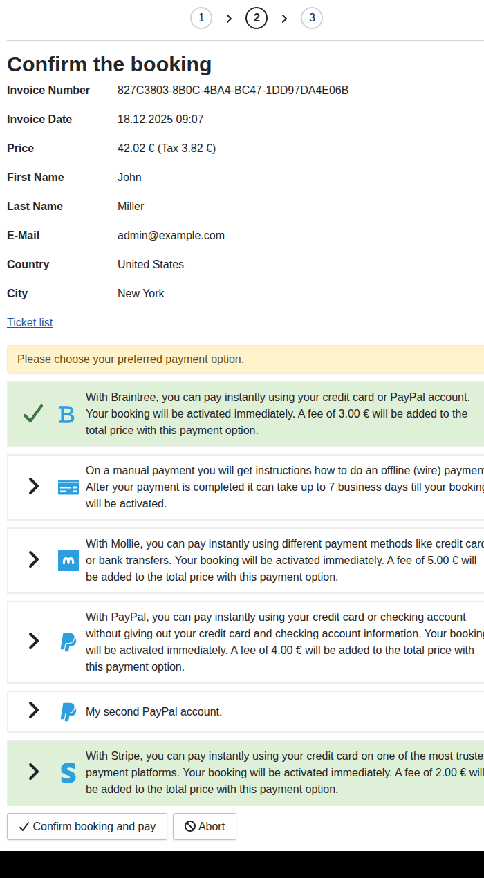 In the third step the booking will be confirmed, afterwards it will be activated. If the booking needs a payment then the list of available payment providers is shown where the attendee has to choose one from.