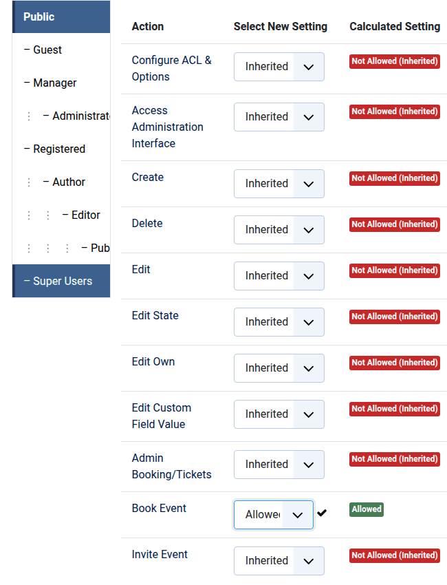 Initially this permission is denied for all users, except the super admins. To control it globally for all calendars, then site admin can change it in the global DPCalendar options. The calendars will inherit it then automatically. There are more information in the ACL article how to use permissions.