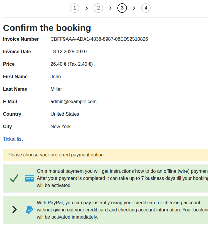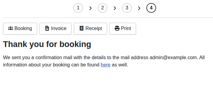 After the "Confirm booking and pay" button is hit, then booking gets redirected to the payment provider page where the payment can be done. If it is an offline payment, means an invoice will be sent out, then the booking gets into an "On hold" state and an information page is shown. The invoice is sent by mail or can be downloaded here as well.