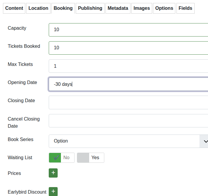 Create an event which happens in the future and set the capacity value to a number higher than 0 (empty means unlimited). Additionally define some optional prices, discounts and other configuration options in the booking tab.