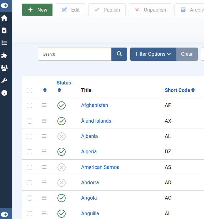 All existing countries are available in the DPCalendar back end. The admin is able to create, edit, unpublish or delete them. This list of countries is used during ticket purchase and for tax assignment. Unpublished countries are not considered for tax application or as option in the booking form. The country itself does have only a short code, like US or DE. The names to display are generated from language files. Every name of the country is compiled from the string "COM_DPCALENDAR_COUNTRY_XX", while XX is the short code. So if you want to change a country name in a specific language, then you need to make a language override.