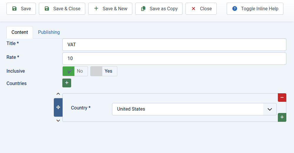 The admin can define unlimited tax rates in the back end in the "Tax Rates" submenu. A list shows the already created tax rates. To set up a new one, click on the "New" button on the top left corner. In the form view the admin can define a percentage of the tax rate. The inclusive flag defines if the ticket prices do contain the tax rate already or if the tax should be added on top of them. An unlimited list of countries can be assigned to the tax rate where it should be applied to.