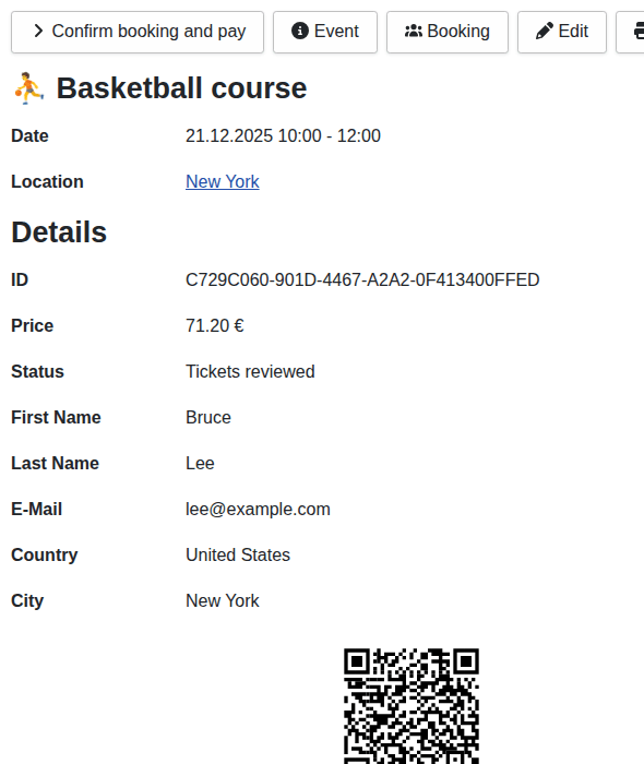 The booking system generates for every ticket a PDF which can be downloaded and is also sent when the booking was created. This PDF and the ticket details page do show a barcode image which can be scanned by the guards on the event entrance. After the barcode is scanned in the ticket get marked as checked in and can't be reused a second time. Like that you can control who did enter the event location.