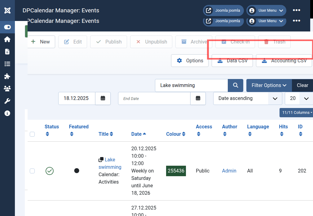 If the exported data should be customized, it is possible to put a PHP script with the name data.php into the folder /administrator/templates/atumn/html/plg_dpcalendar_spreadsheet. Strong PHP skills are required as it requires knowledge how to use language constructs and the MVC of Joomla.