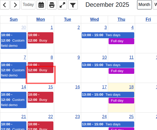 Access control defines who can see what in Joomla. It can be set per calendars and/or events. DPCalendar has two different access controls defined by two settings. The Access property defines who can see the whole calendar or the event and the Access Content property defines who can see the event details. If a user has no right (access) to see the content of an event, they will see Free/Busy placeholder text instead. This means you can show the visitor that you are doing something, but not what.