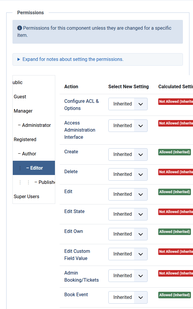 Some users may have several calendars that have different permissions on a calendar by calendar basis. The calendar permissions override the component permissions on a per-calendar basis. This means that they inherit the permissions from the component permissions initially, but can be changed later here.
