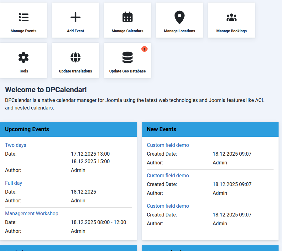 The dashboard does give you a quick overview about the status of DPCalendar. You can quickly navigate to common actions and see recent event activities.