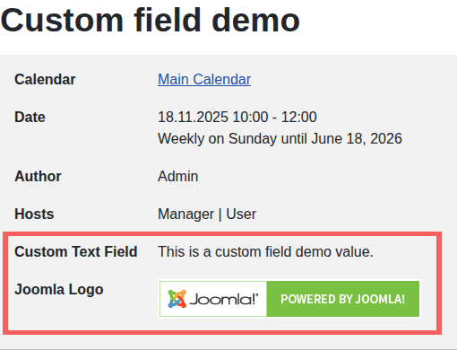 Custom fields in Joomla are a powerful way to implement specific use cases without additional extensions. Actually this feature was sponsored by us to the core. So it is obvious that DPCalendar will use them too as it does already with other core features. Custom fields exist for many different form fields and extend a core item like article or DPCalendar event with more configuration options which are then rendered on the front.
