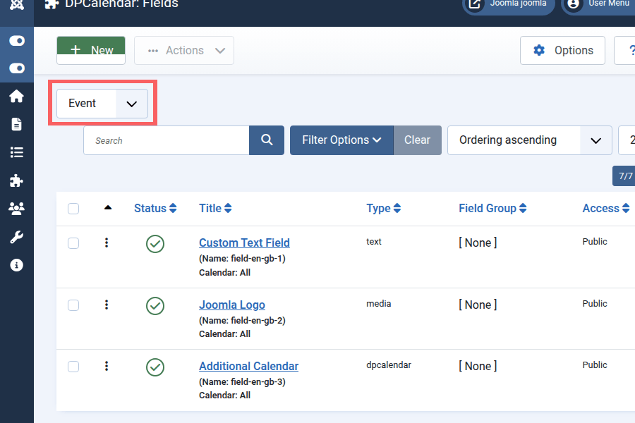 The fields can be set up in the back end, similar to what you can do already with articles. The Fields submenu renders a list of existing custom fields. Clicking on a field allows you to edit it. New ones can be created with the New button in the top toolbar. If you want to create other custom fields, that events, you have to switch the context in the top left select box. When you create a new custom field then you can define it's type, eg. text area select box, etc. In DPCalendar it's now possible create a calendar custom field which allows you to select an existing calendar and attach the event to it. More information can be found in the Fields plugin article.