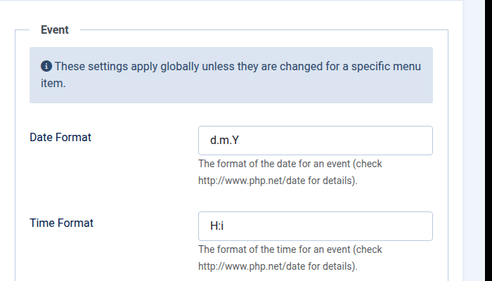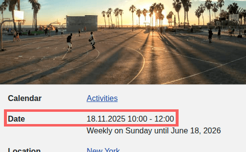 The DPCalendar Joomla event manager offers options within a module or menu link configuration to adapt the date and time format of the displayed events. This means the user can customize the date appearance to suit their needs and target audience.