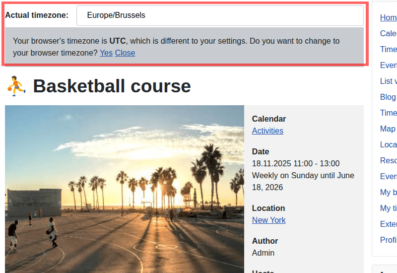 Additionally you can enable the timezone switcher in the DPCalendar options, which allows to change the actual timezone by the visitor himself on every page. When the browser timezone differes than the options timezone, an information panel is shown to switch the timezone to the browser one.