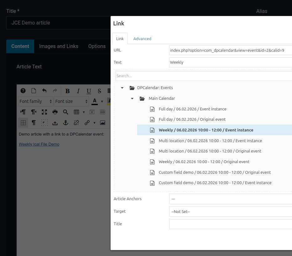 JCE DPCalendar links integration