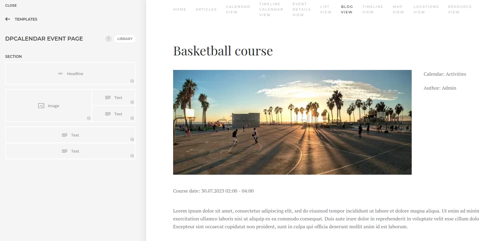 In DPCalendar it is possible to create a complete new layout for a list or event details menu item. Like that it is possible to integrate DPCalendar even better into your web site. As soon as a template is created for a calendar where the menu item is attached to, then the "Builder" option is available on the respective layout. More information can be found in the official YOOtheme docs about pages and posts.