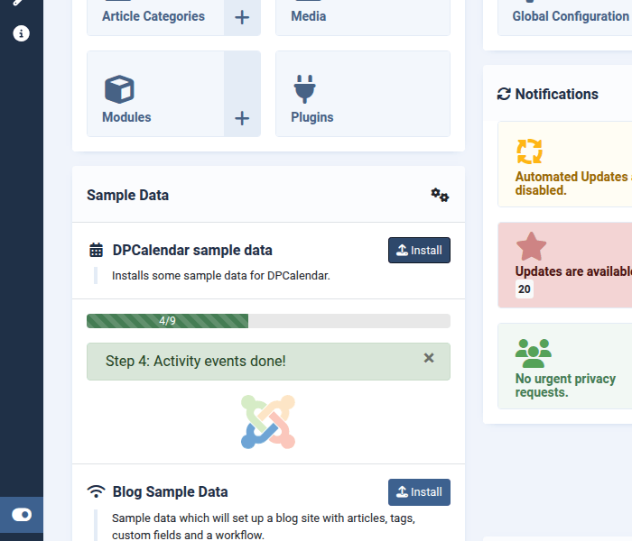 The sample data plugin offers the possibility to install DPCalendar sample data the same way as core sample data. Click on the back end control panel in the Sample Data module on DPCalendar sample data and the calendars and events will be set up. Please keep in mind that this operation can not be undo!!