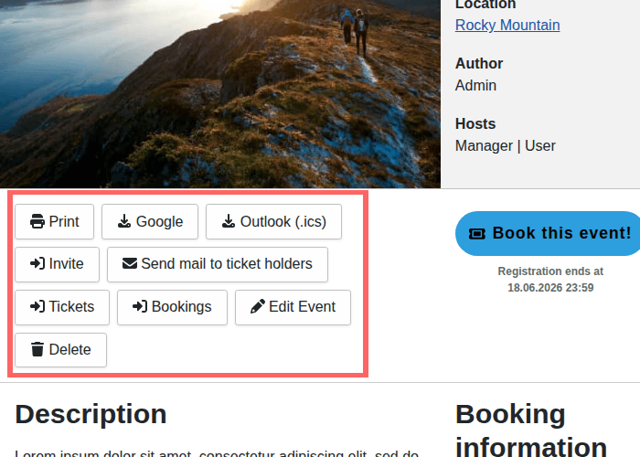 If you are logged in as admin then you will see some more action buttons which do allow you to manage the event.
