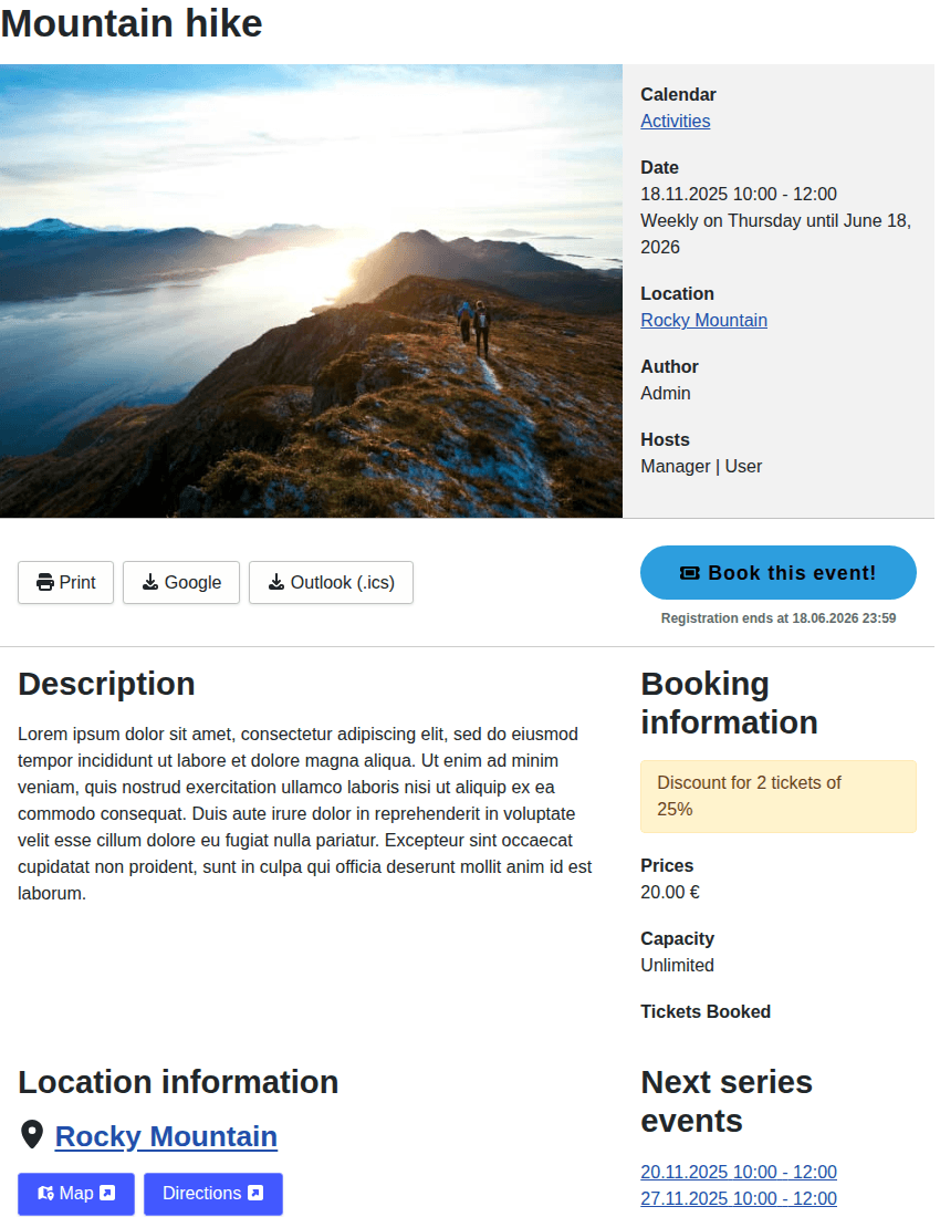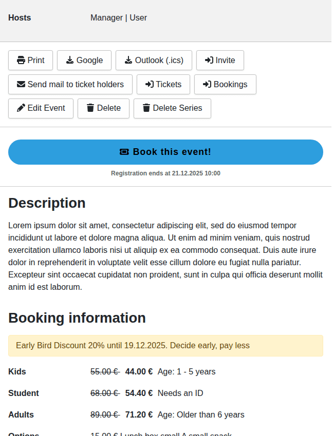 If bookings are activated for the event and the visitor has the permission to book the event, then a link will be shown to guide the visitor to the booking form. The booking part of the event detail age does show all the relevant booking information like the different prices, discounts and the capacity.
