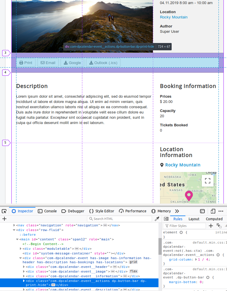 The different blocks like the image, information panel, location part or buttons are built stacked when inspecting the HTML markup. With CSS grid we are positioning them the way we want. This means for the site admin, that it is easy possible to rearrange them with just CSS to perfectly fit your template, no template overrides are needed. You can then also define trough media queries your layout to have it optimized for every screen size. For example when you want to move the map below the description, use the following CSS code in your template's custom.css file (or what way your template offers to add your own CSS):