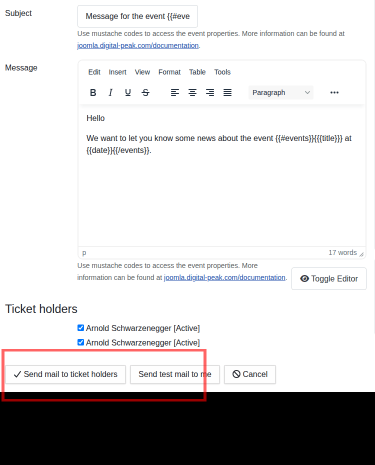 If the author, host or booking admin is logged in and visits the event details page, it is possible to send a mail to the event attendees. When clicking on the "Send mail to ticket holders" link then a new page opens which shows an form to input a subject and mail text. Additionally it is also possible to select the individual ticket holders where the mail is sent to. It is also possible to send a test mail to the currently logged in user first.