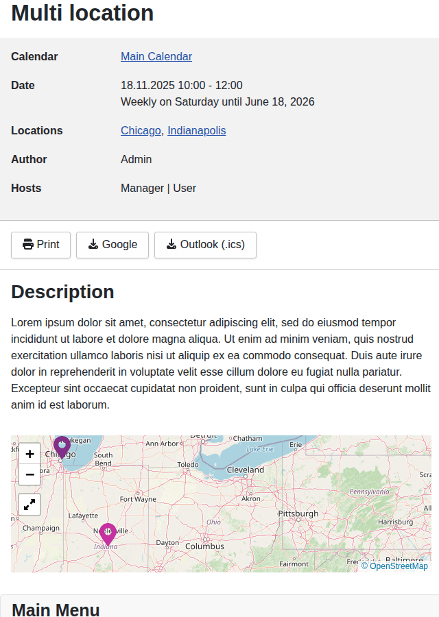 The Event menu item shows a single event details page. On the top are share buttons rendered to help promoting your site on different social media networks. Beside them are action buttons displayed which do allow to export the event to Google calendar or as .ics file. If the visitor wants to send the event page, there is an E-Mail button available which opens a new window to send the link to a friend. For those who like to print out the details page, we have a optimized print view, which can be opened directly through the print button.