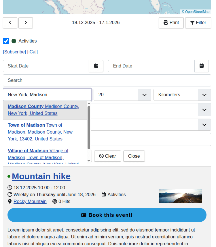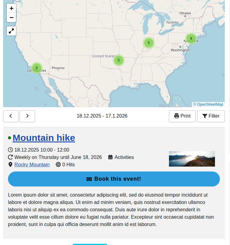 The Event list menu item shows a list of upcoming events, similar to a Joomla articles category list, below a map. Initially is the list shown for a given timeframe, specified in the options. Through the navigation button, can the visitor browse the events in time.