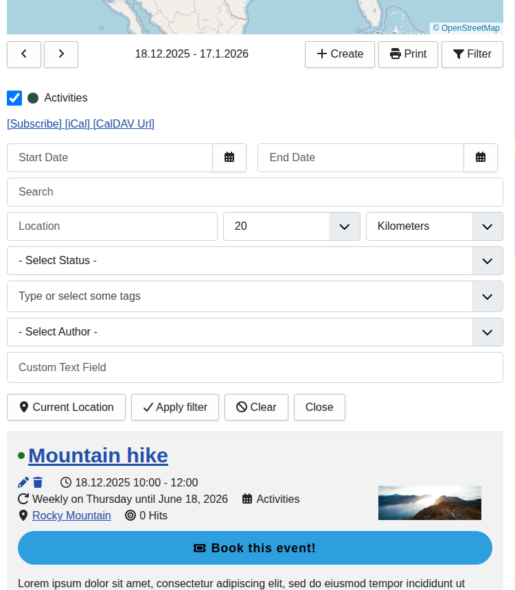 Above the events list is a panel with various different filter possibilities. Initially the panel is hidden and can be expanded by clicking the filter button. There is an option to define the initial state of the filter panel if it should be shown closed or expanded or even hidden for the visitor. The calendars can be deselected to show only events of the calendars the visitor wants. There is a search area available which allows to search between dates and in content. Users are also able to search events in a certain radius for a specific location. For every event text custom field is a filter shown as well, like that it is possible to have a more fine grained search filter.