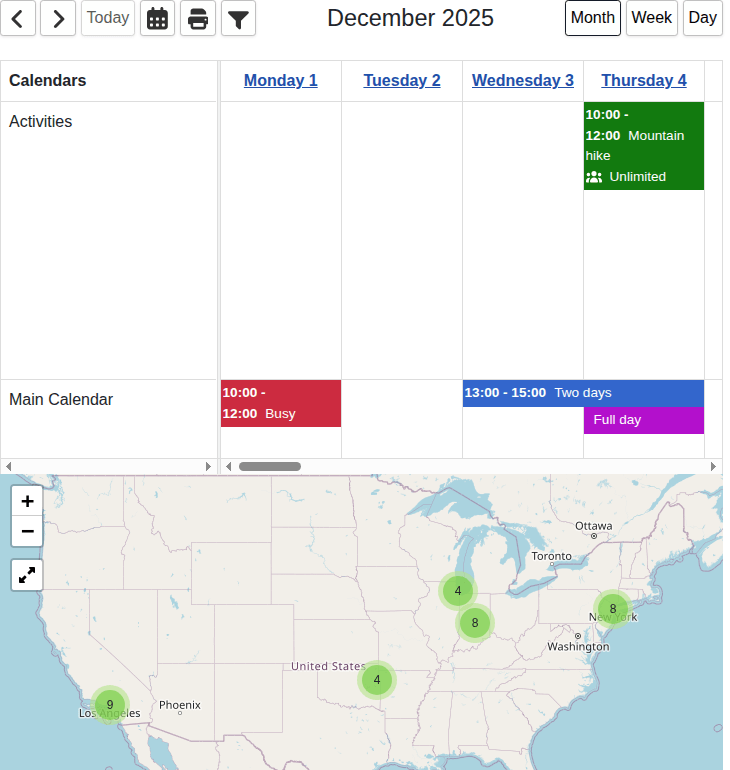 The map below the calendar shows the events from the current view based on their locations. If there are multiple events on close locations or even on the same location, then a cluster is shown which shows an icon about how many events do appear on that spot. Clicking on the cluster icon will expand the events where the visitor can click on them to show their info popup.