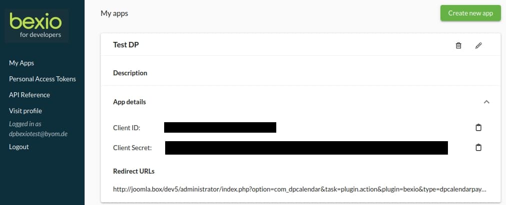 • Copy the client ID and secret to the plugin from the Bexio developer site.