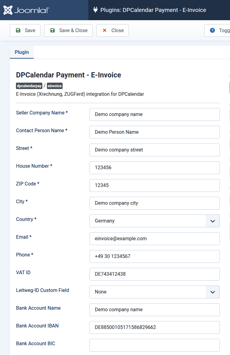 To integrate electronic invoices, it is mandatory to enable the plugin as first step. For valid XML, some mandatory information about the company who is selling events must be provided in the plugin configuration. The bank information is optional, when set, then the invoice is always treated as wire payment and adds the necessary information.
