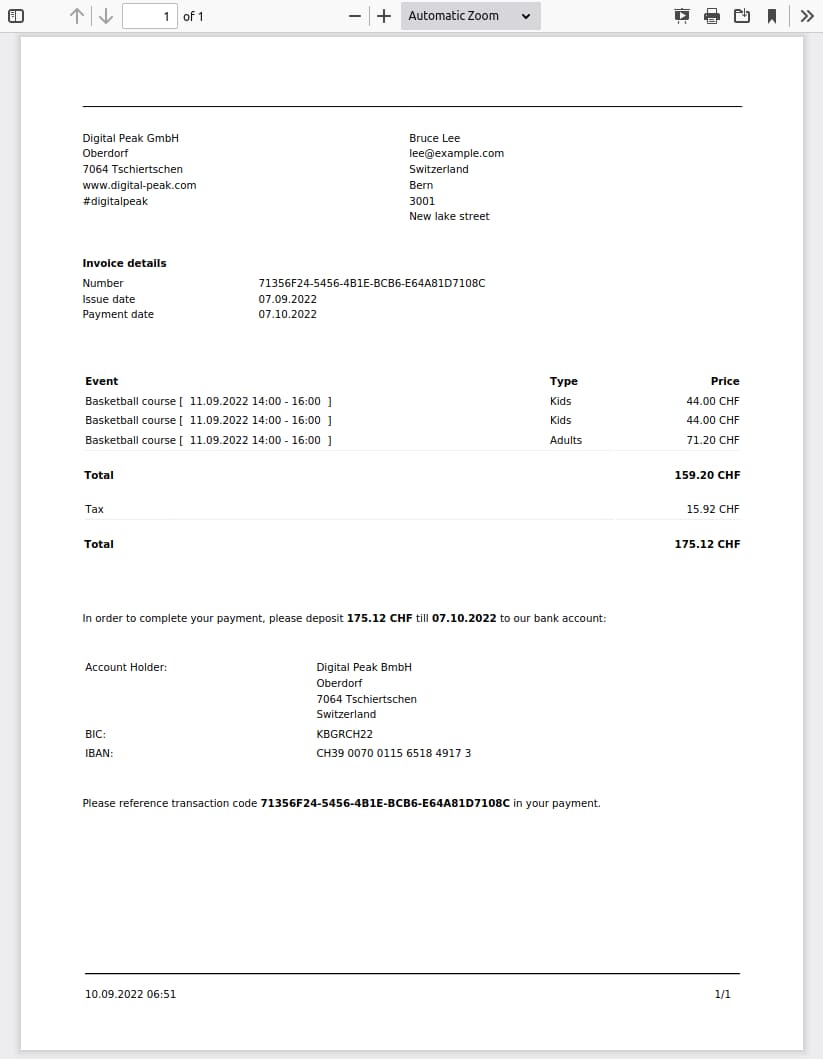 A special parameter in the invoice is the "bankInformation" parameter which contains the payment statement text from the payment provider configuration. The DPCalendar PDF options like header, logo or address are used in the invoice as well to be inline with the other system generated PDF files.