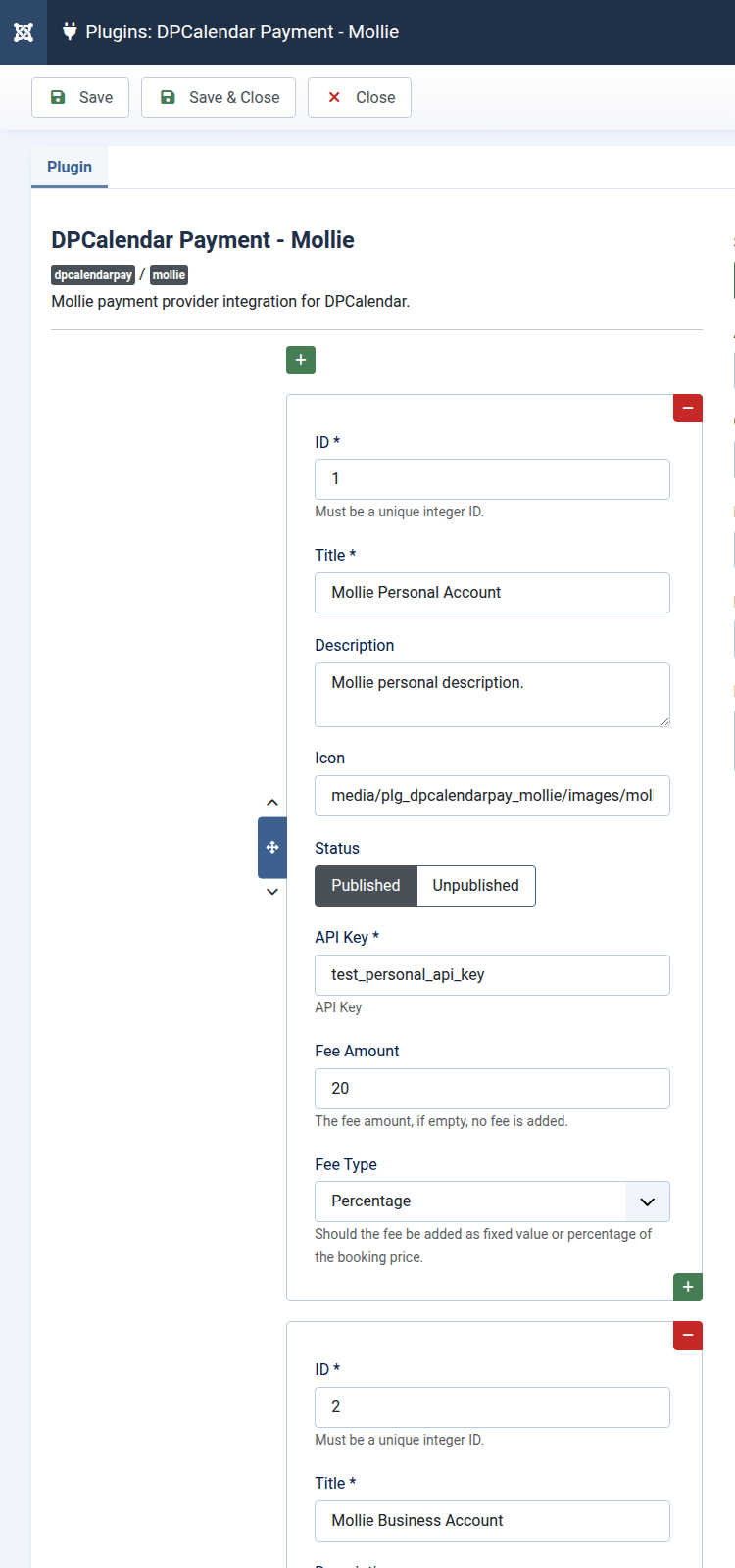 The DPCalendar Mollie plugin allows to add unlimited Mollie accounts to DPCalendar. When the plugin is opened in the back end, then you can click on the "+" button to add a new configuration. There you can fill the following fields: