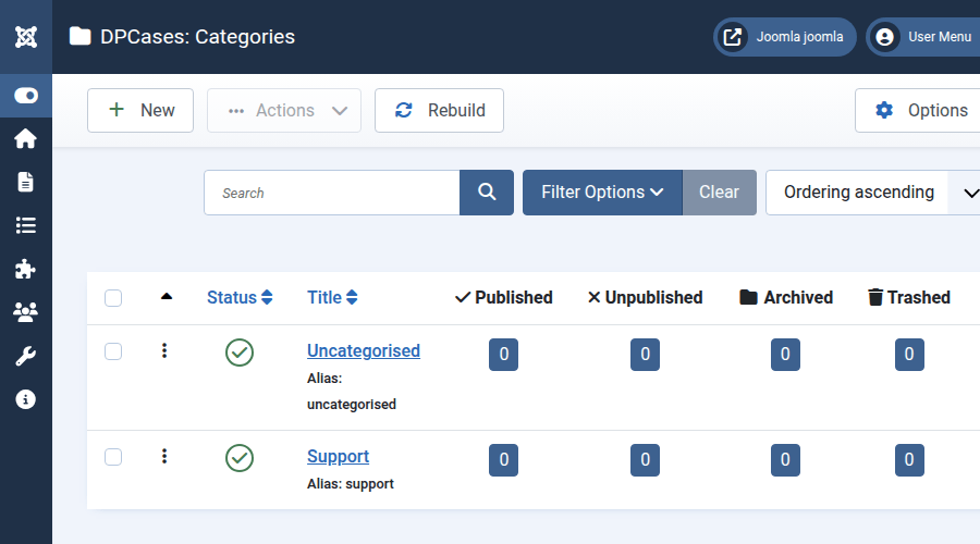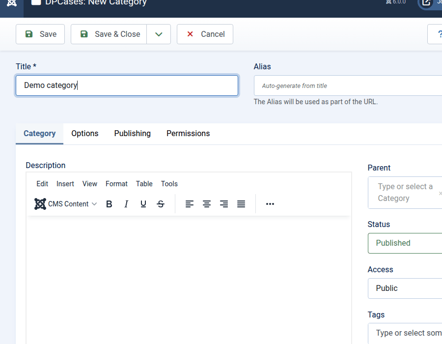 The options tab of a category does contain some special DPCases attributes beside the default ones from an ordinary Joomla core category.