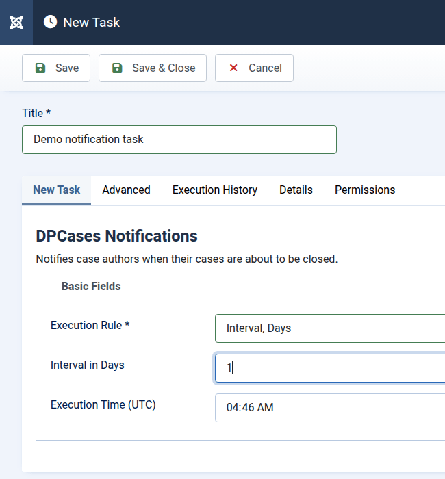 Open the task scheduler in the back end and create a task "DPCases Notifications" task. Set as "Execution Rule" as interval days and let it run once every day, preferably somewhere in the night.
