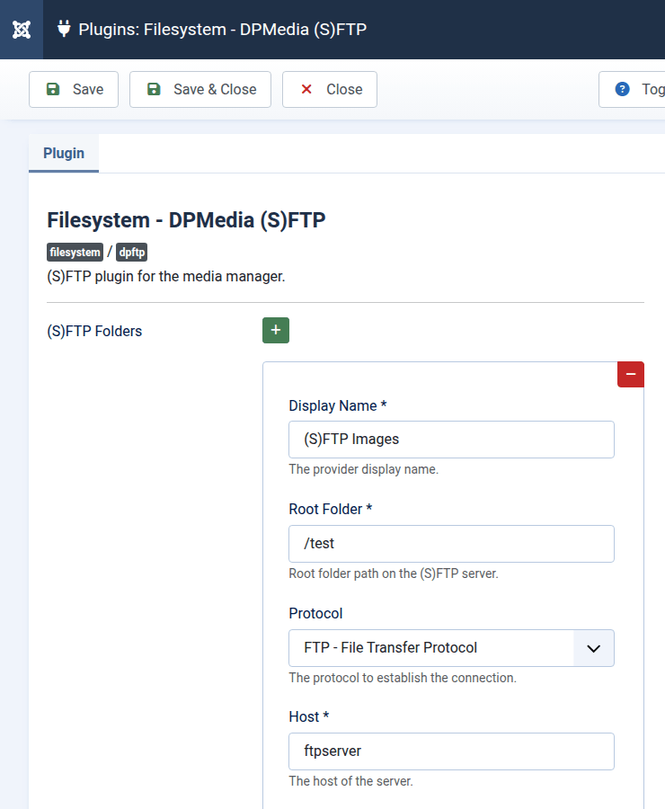 The FTP plugin integrates media data from an FTP or SFTP server into the Joomla core media manager. It allows the admin to select images in articles and any other extension which uses the core media manager. Beside that it is possible to create folders, upload images, rename and delete the data directly from within Joomla on the (S)FTP server. It's possible to add unlimited different (S)FTP servers in the plugin.