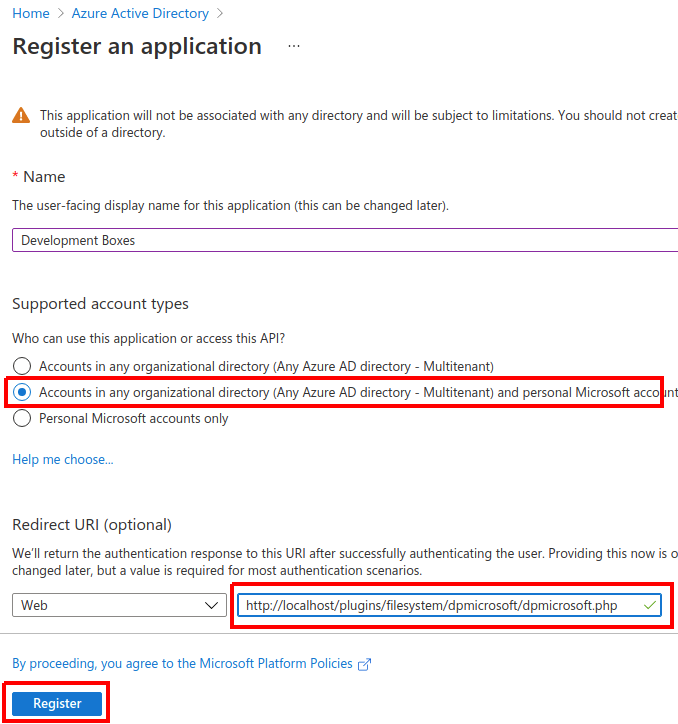 Give it a name and select "Accounts in any organizational directory (Any Azure AD directory - Multitenant) and personal Microsoft account". In the "Redirect URI" field you have to put an url with the following parameters: