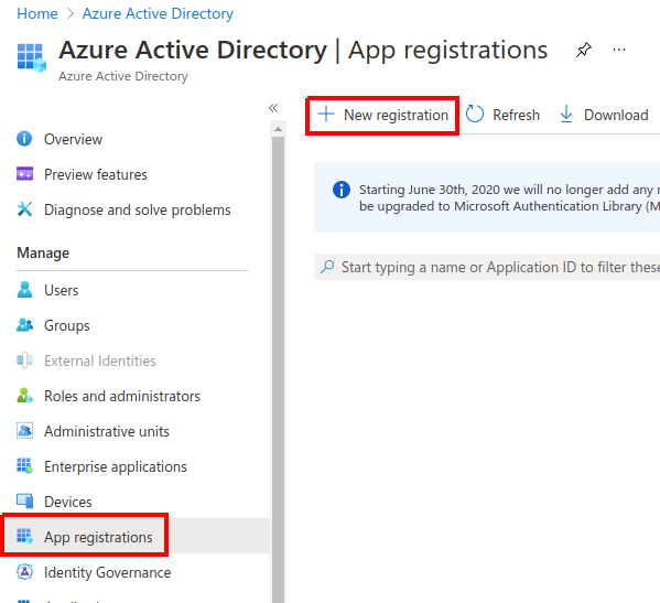 Log in into the Microsoft Azure portal. Click on the "Azure Active Directory" button and then on "App registrations". On the top of the page click on "+ New registration" which forwards you to the app registration page.
