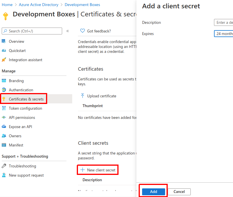 Once the app is created you need to create a client secret. Click in the sidebar on "Certificates & secrets" and then on "New client secret". An Overlay dialog will open. Choose there 24 months and then click on the "Add" button. In the client secrets list you will see now the new secret. Copy the value to a text editor as the secret will be only visible once.