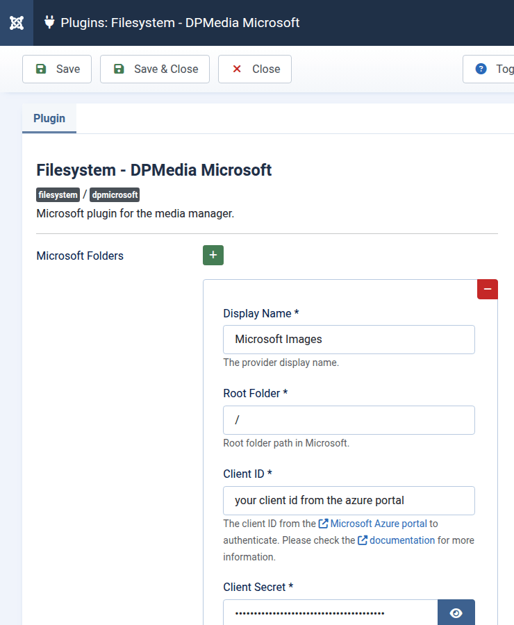 The Microsoft plugin integrates media data from your Microsoft Drive storage into the Joomla core media manager. It allows the admin to select images in articles and any other extension which uses the core media manager. Beside that it is possible to create folders, upload images, rename and delete the data directly from within Joomla on your Microsoft storage. It's possible to add unlimited different Microsoft accounts in the plugin.